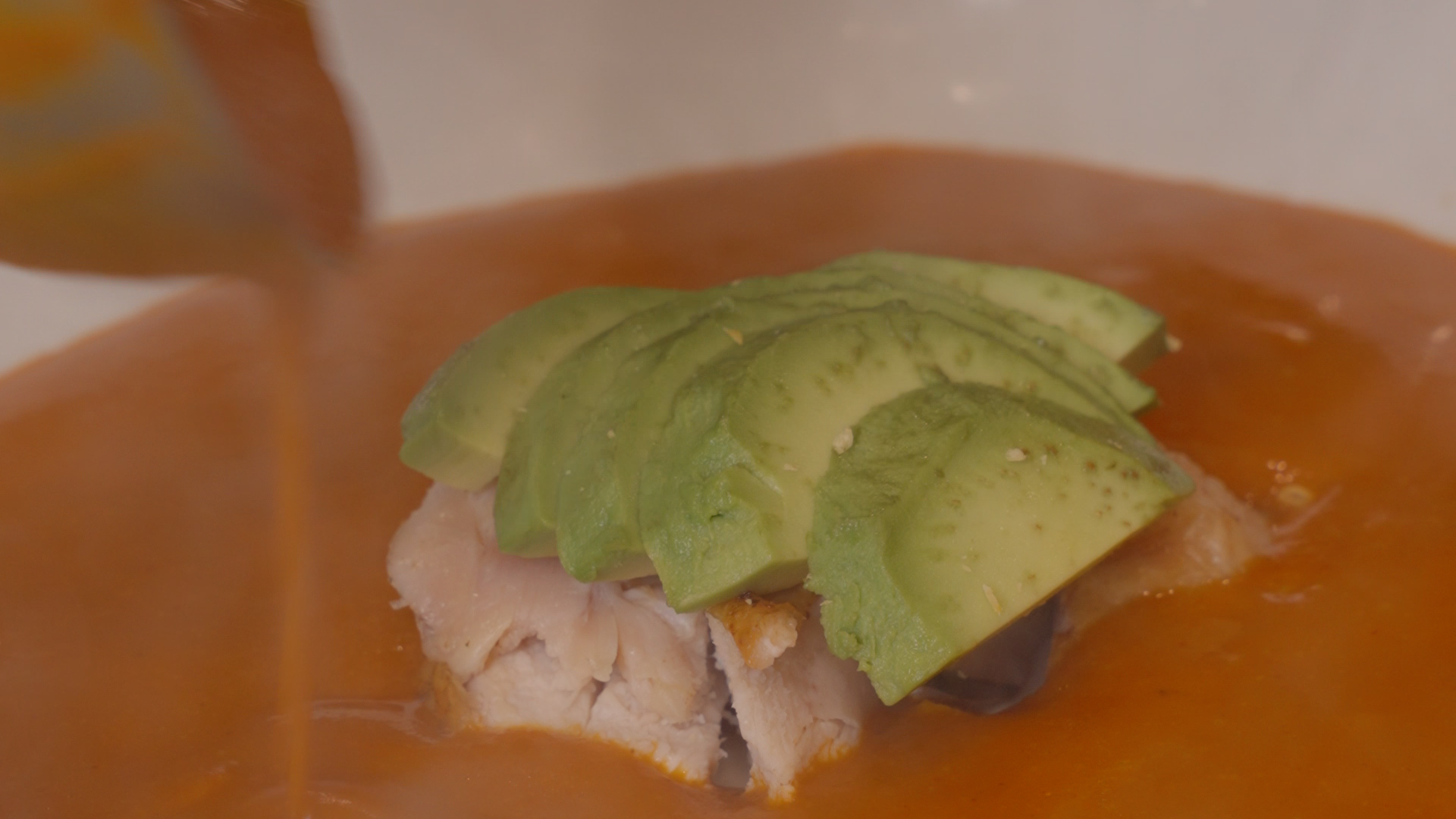 - Ladle the hot soup around the chicken and avocado.