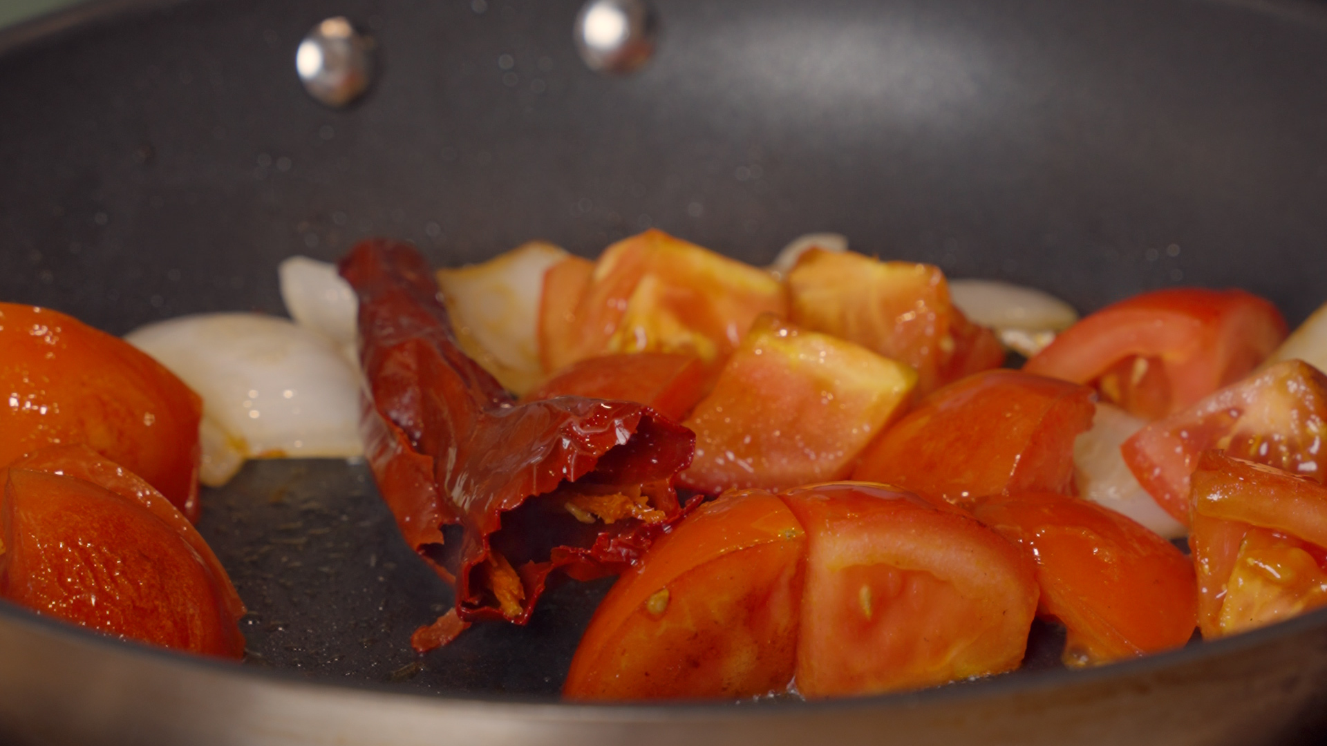 - Add the stemmed and seeded Anaheim and chipotle peppers, and cook until softened, about 2-3 minutes.